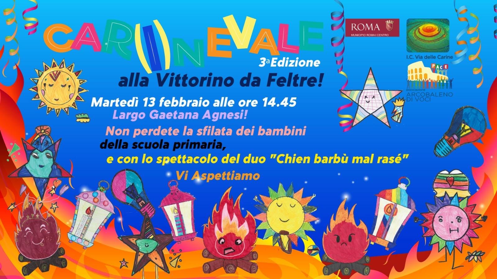 Il giorno martedì 13 Febbraio , alle ore 14,45, gli alunni di tutte le classi della scuola primaria Vittorino da Feltre sfileranno con le loro maschere, create insieme ai loro insegnanti, presso Largo Gaetana Agnesi . Al termine della sfilata i bambini assisteranno allo spettacolo comico del duo "Chien barbù mal rasè"